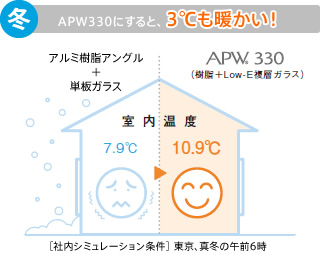 省エネ効果あり。真冬ではLow-E複層ガラスの熱の逃げにくさは、単板ガラスのなんと約4倍。真夏では太陽の熱をなんと約60%もカットします。